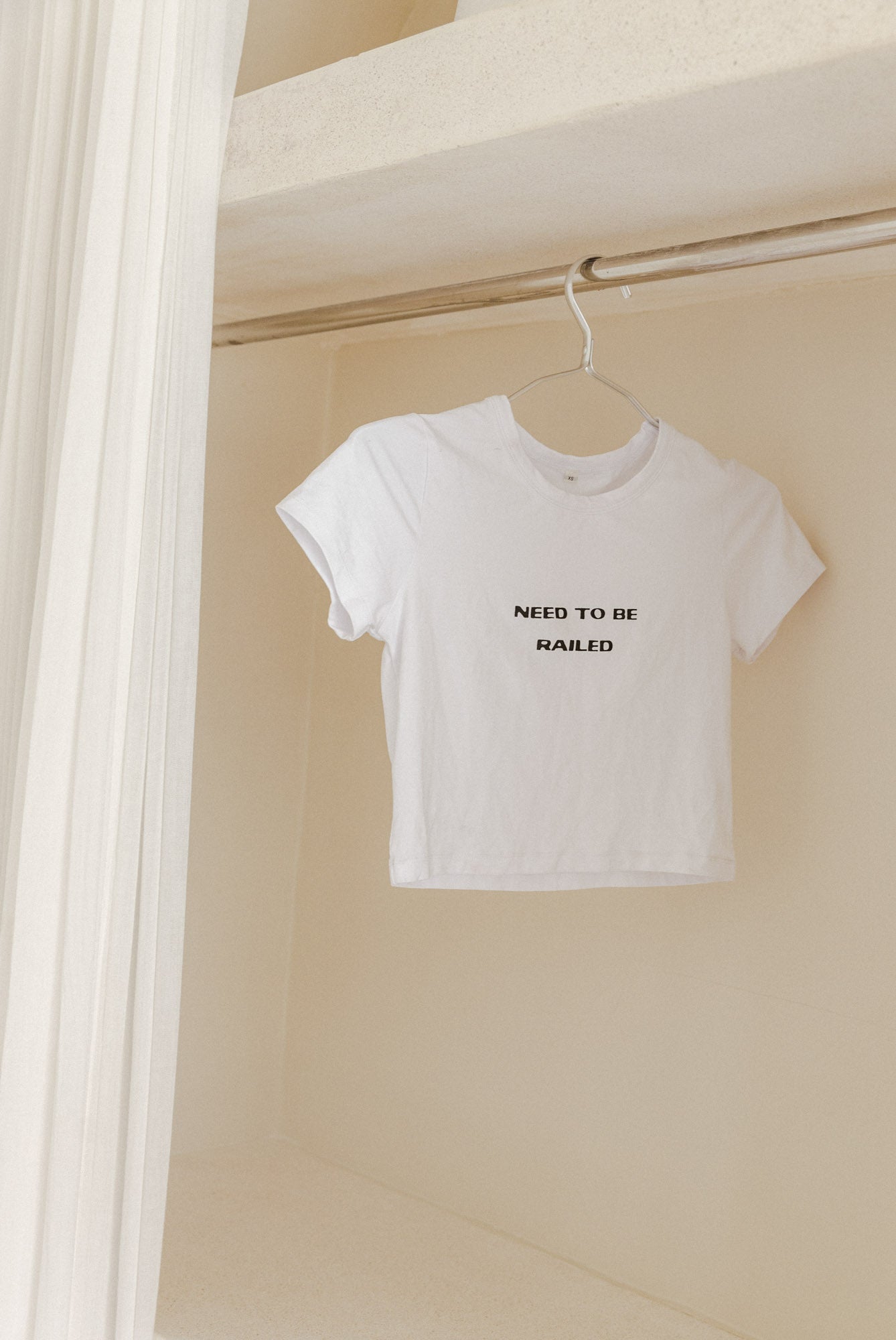 our most unhinged “rail me” baby tee is a white baby crop tee made for those who are a little chaotic , whether you’r...